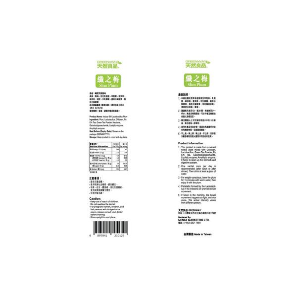 Greenway Slim Plum carefully selects a variety of natural herbal plants combined with Chitosan, Lactic Acid Bacteria, Green Tea Powder, Pu-erh Tea, Galacto-oligosaccharides, and dual digestive enzymes to create a highly effective slimming and bowel regulation product. It promotes gut health, removes accumulated waste, aids natural detox and fat breakdown, supporting healthy weight loss and abdominal tightening.