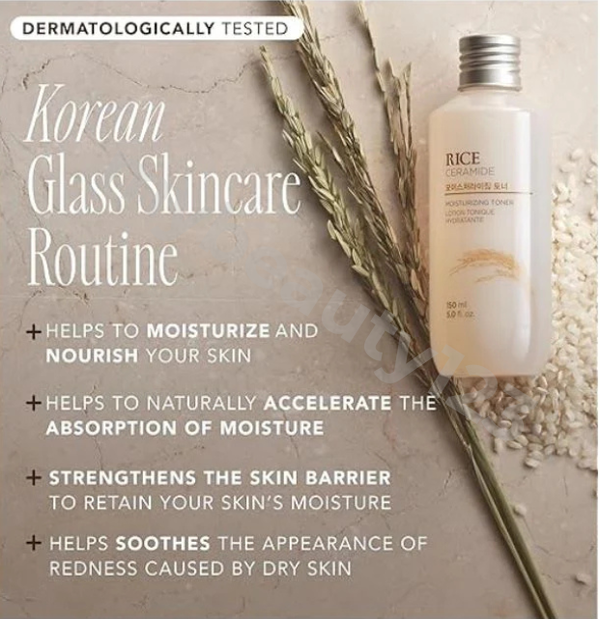 The Face Shop Rice Ceramide Moisturizing Toner contains Rice Extract, Ceramide, glycerin, and lecithin to deeply moisturize and soften skin while strengthening the natural barrier. It improves skin texture and radiance, prepping skin for better absorption of serums and creams. Suitable for dry, normal, and sensitive skin types.